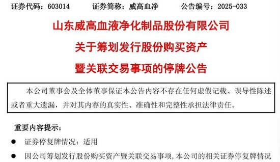 在公告中,威高血净披露,本次交易尚处于筹划阶段,有关事项存在不确定性。为了维护投资者利益,保证公平信息披露,避免对公司股价造成重大影响,根据相关规定,公司股票自2025年10月20日(星期一)开市起停牌,预计停牌时间不超过10个交易日。