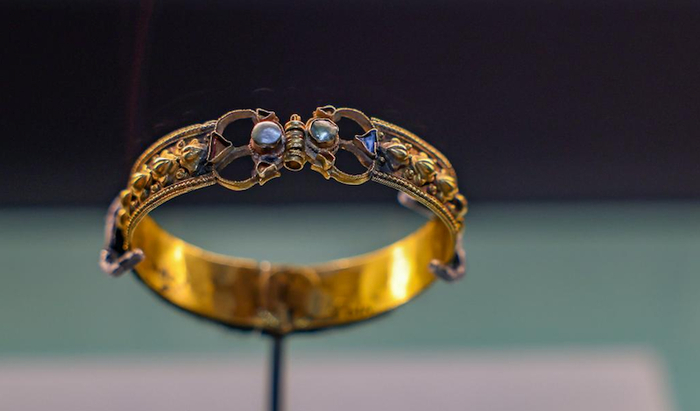 2024年12月6日,“古波斯的荣耀——伊朗文物精华展”在新疆维吾尔自治区博物馆开幕。图为展出的金手镯。(新华社记者 陈朔摄)