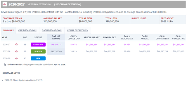 杜兰特这份合同的细节,26-27赛季价值4326万,27-28赛季4673万(球员选项)。杜兰特原本是可以跟火箭签下一份两年1.2亿的顶薪合同,但他为了帮助火箭保持薪金灵活选择了降薪3000万,杜兰特愿意为了球队做出牺牲。