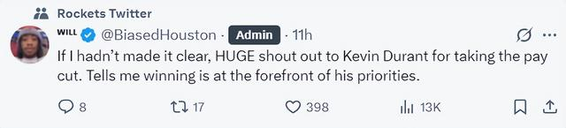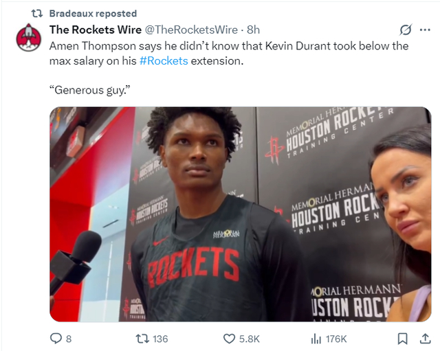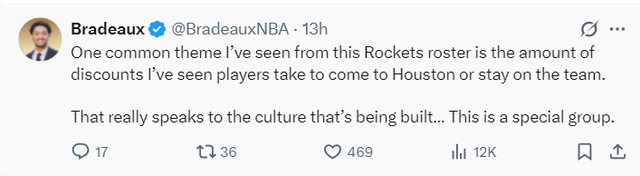 火箭记者Bradeaux写道:从这支火箭队的阵容中我们应该关注到一个点,很多球员为了来到火箭或者留下火箭都做出了巨大的让步,在薪水上做了诸多的牺牲,这反应了球队正在形成的文化,这是一个特殊的群体。