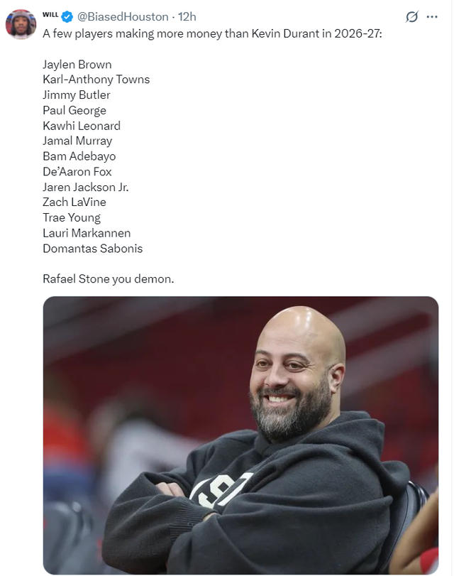 随后休媒晒出26-27赛季薪水会超过杜兰特的球员:杰伦布朗、唐斯、巴特勒、乔治、伦纳德、贾马尔穆雷、阿德巴约、福克斯、小贾伦杰克逊、拉文、特雷杨、马尔卡宁、小萨博尼斯。(这13人有几人能比KD强?)