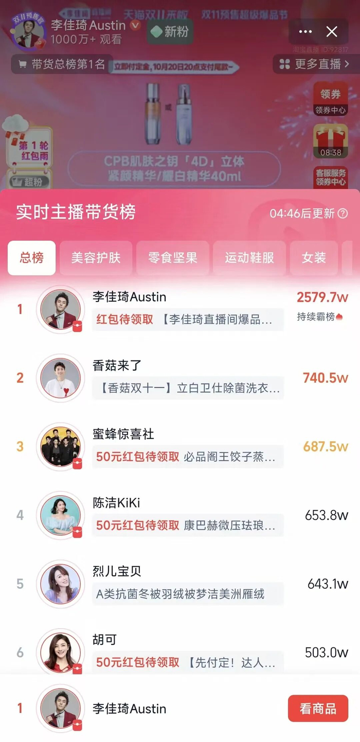 淘宝平台的头部主播李佳琦,直播间首小时访客人数增长超45%,加购GMV同比正增长,并持续断层领跑平台带货总榜,超过2024年同期水平