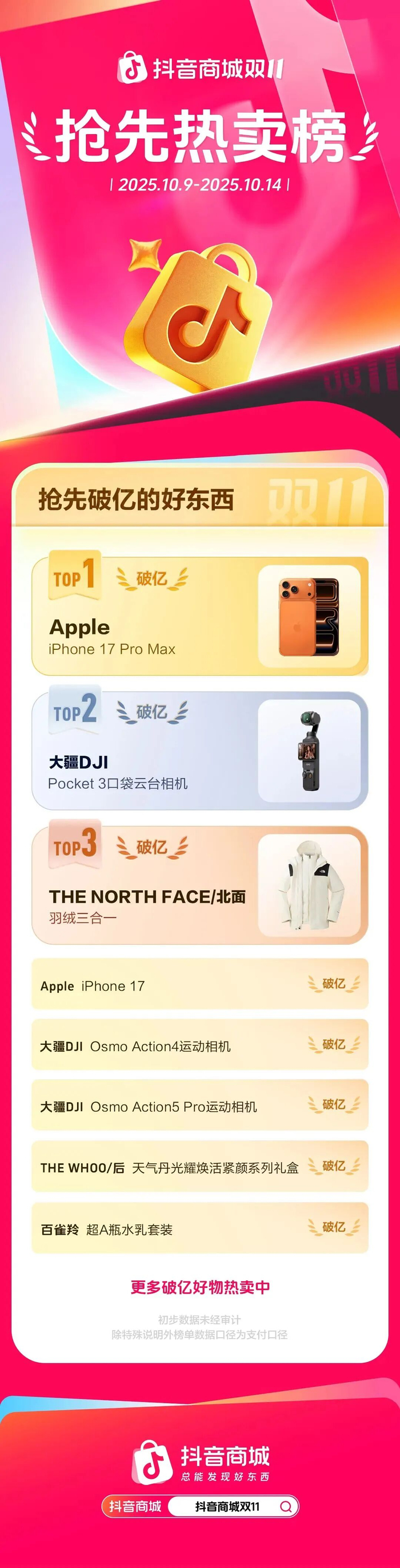 截至10月14日,超1.6万个品牌销售额同比翻倍,抖音电商双11搜索销售额同比增长74%。手机、数码、护肤、运动户外等行业破亿爆款涌现,平台的“抢先热卖榜”也提前揭示了双11爆款趋势。