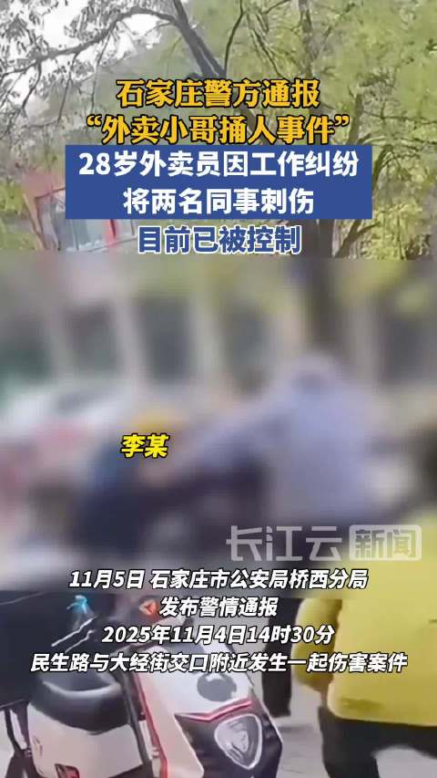 11月5日中午,石家庄市公安局桥西分局就此事发布警情通报,通报中表示:11月4日14时30分许,在我区民生路与大经街交口附近发生一起伤害案件。因工作纠纷李某(男,28岁)持工具刀将两名同事扎伤。民警出警后将李某当场控制,伤者被及时送医救治,无生命危险。
