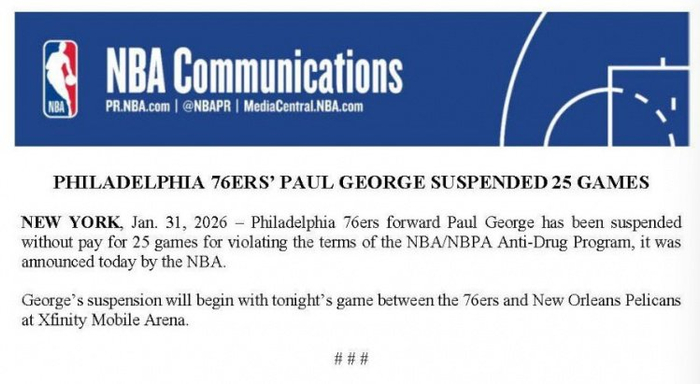 直播吧2月1日讯 NBA官方宣布,76人队前锋保罗·乔治因违反联盟禁药政策,将被禁赛25场。