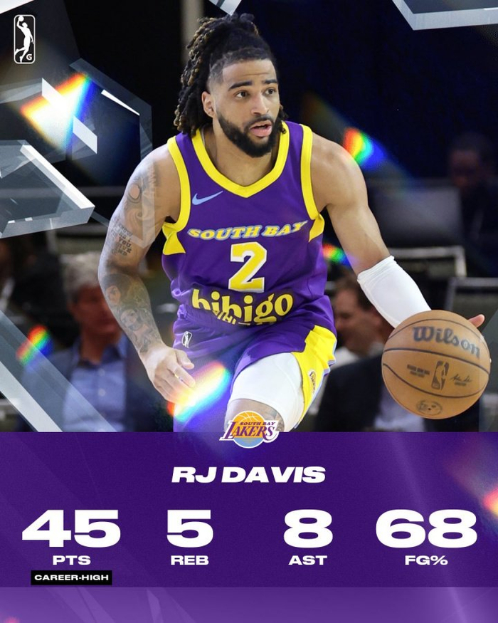 上一场南湾湖人125-118击败盐湖城星的比赛中,RJ·戴维斯就有出色发挥,他出战34分钟,22投11中,三分7中4,砍下30分10篮板10助攻的三双。
