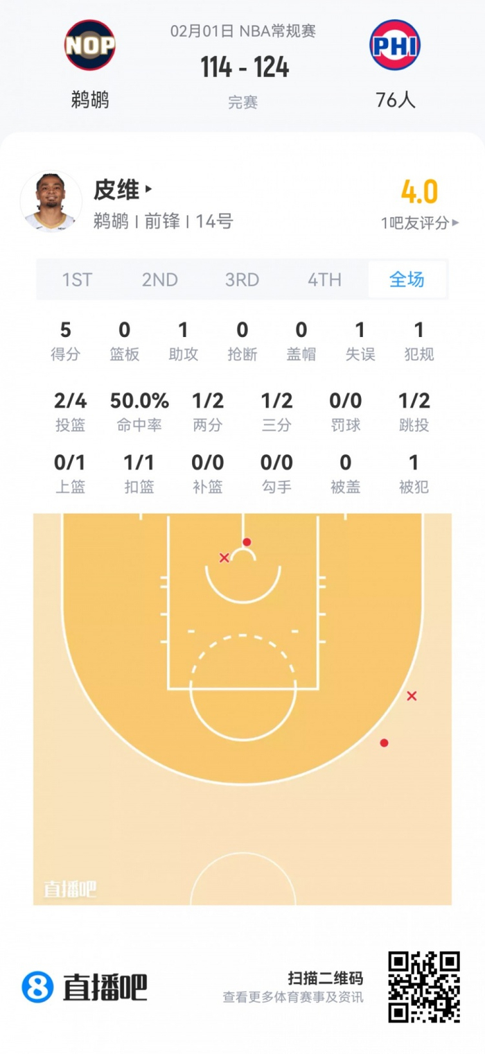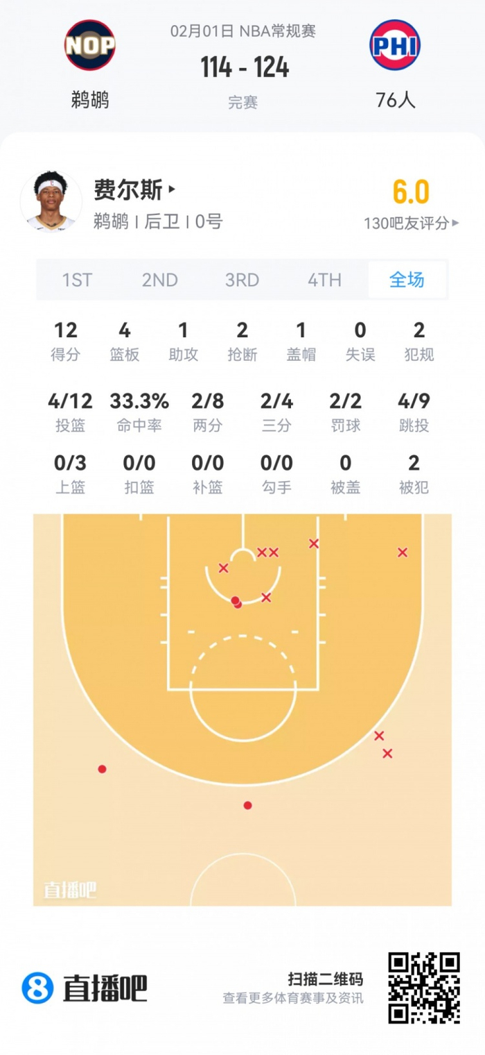 鹈鹕首轮7号秀费尔斯 登场21.4分钟