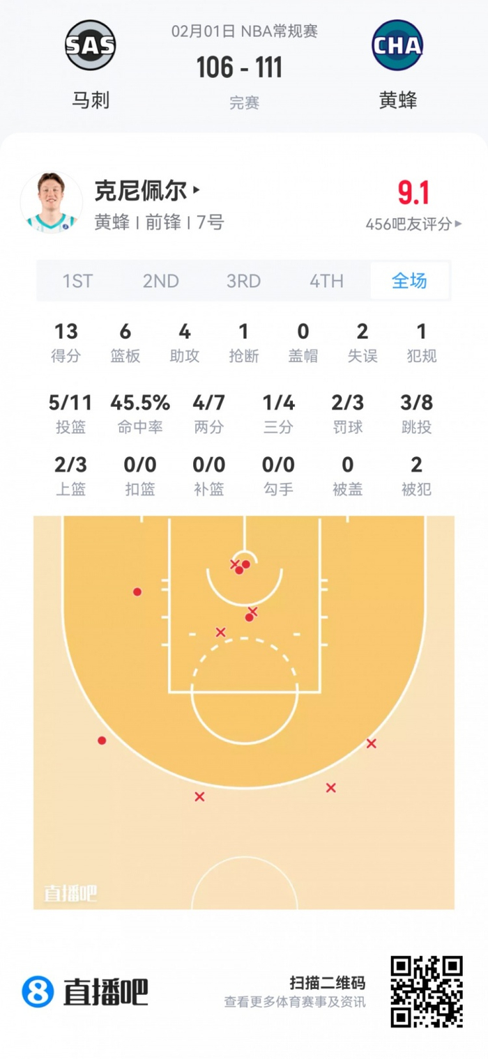 黄蜂首轮4号秀克尼佩尔 登场35.1分钟