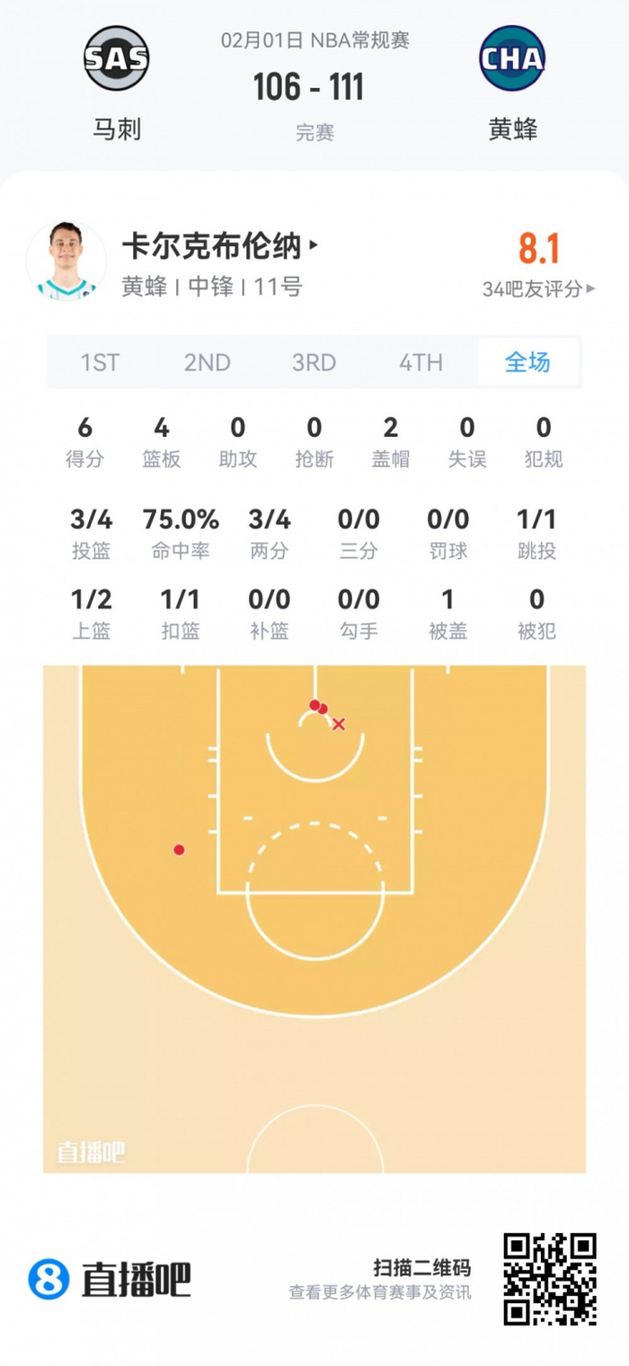 黄蜂次轮34号秀卡尔克布伦纳 登场14.3分钟
