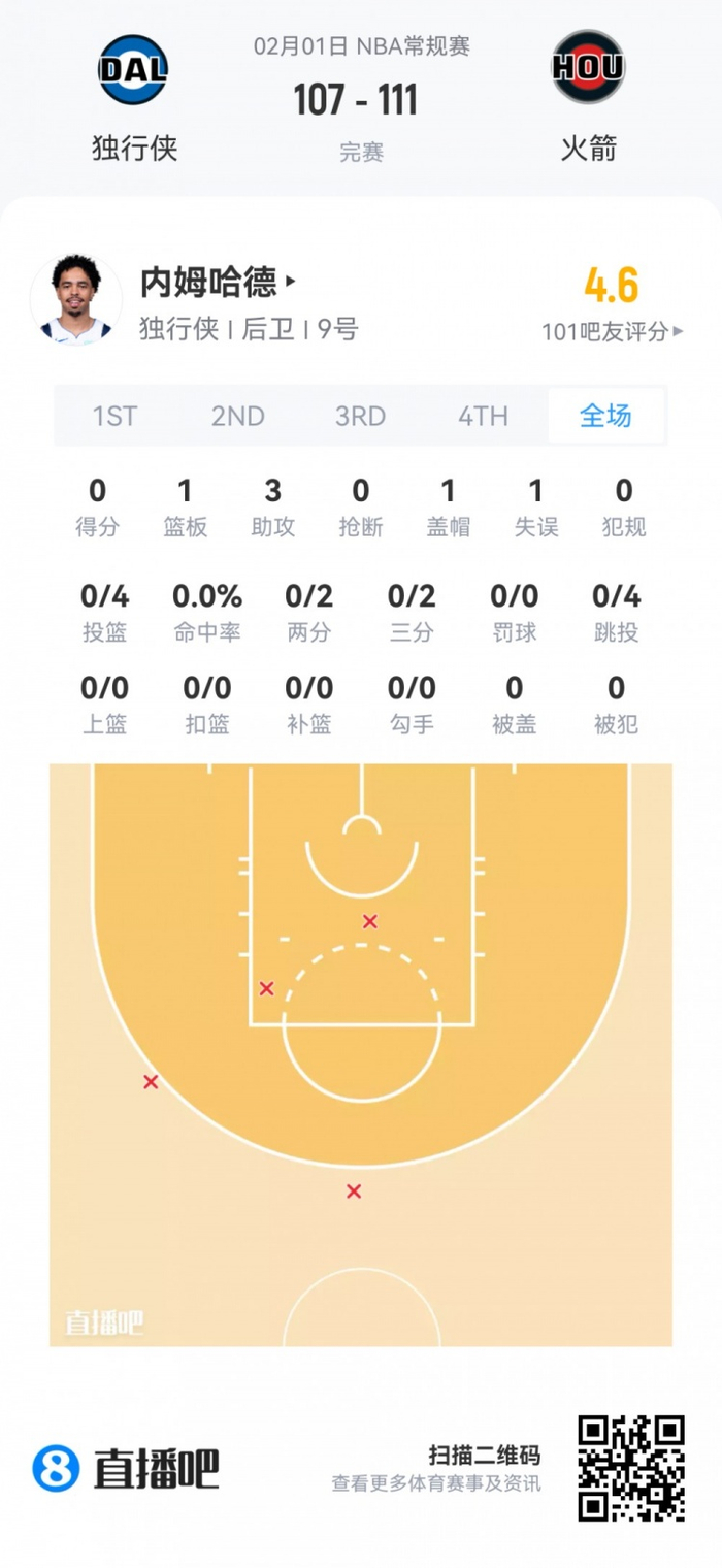 独行侠落选秀内姆哈德 登场11.1分钟