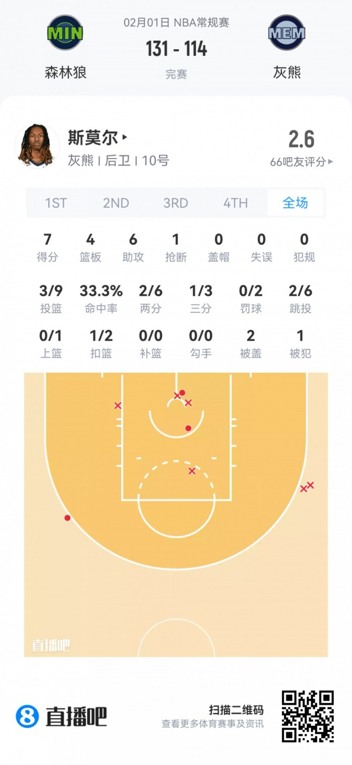 灰熊次轮48号秀斯莫尔 登场21.6分钟