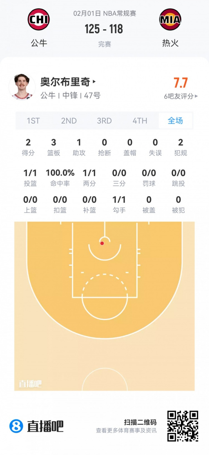 公牛次轮55号秀奥尔布里奇 登场8.2分钟
