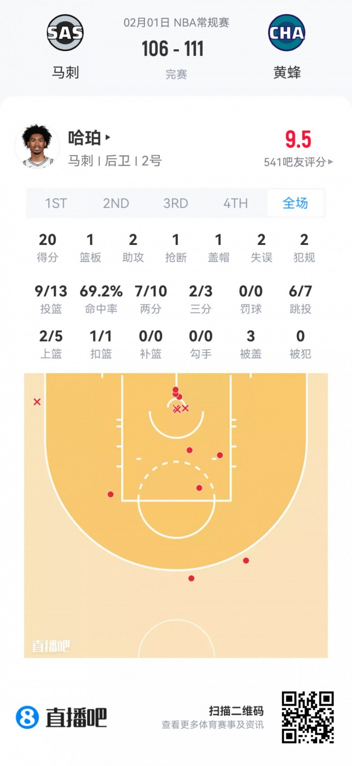 马刺榜眼秀哈珀 登场23.2分钟