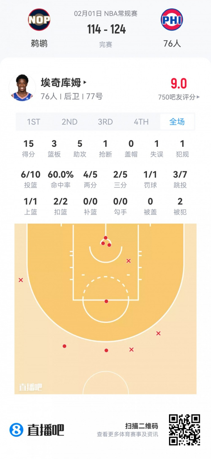 76人探花秀埃奇库姆 登场37.1分钟