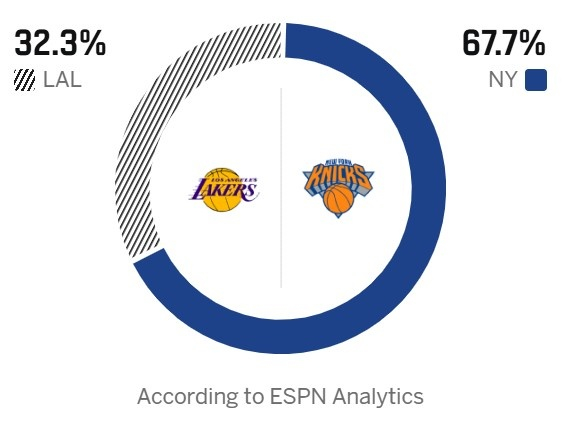 今天,ESPN预测本场胜率,湖人32.3%,尼克斯67.7%。