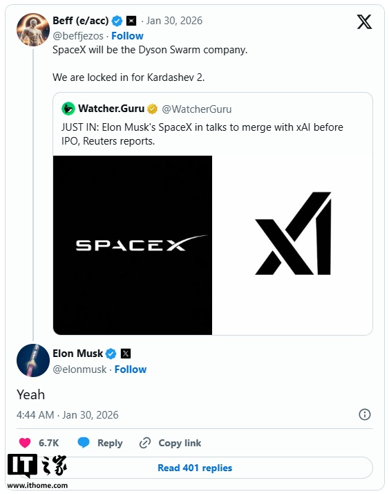 IT之家 2 月 1 日消息,埃隆・马斯克在 X 平台上对一篇关于 SpaceX 与人工智能初创公司 xAI 可能合并的报道帖子做出了积极回应,似乎证实了相关报道。