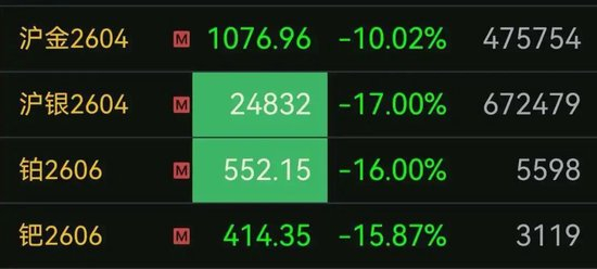 2月2日,国内贵金属期货价格开盘普跌。文华财经数据显示,截至9:04,沪银期货主力合约跌停,沪金期货主力合约跌超10%,铂期货主力合约跌停,钯期货主力合约跌超15%。