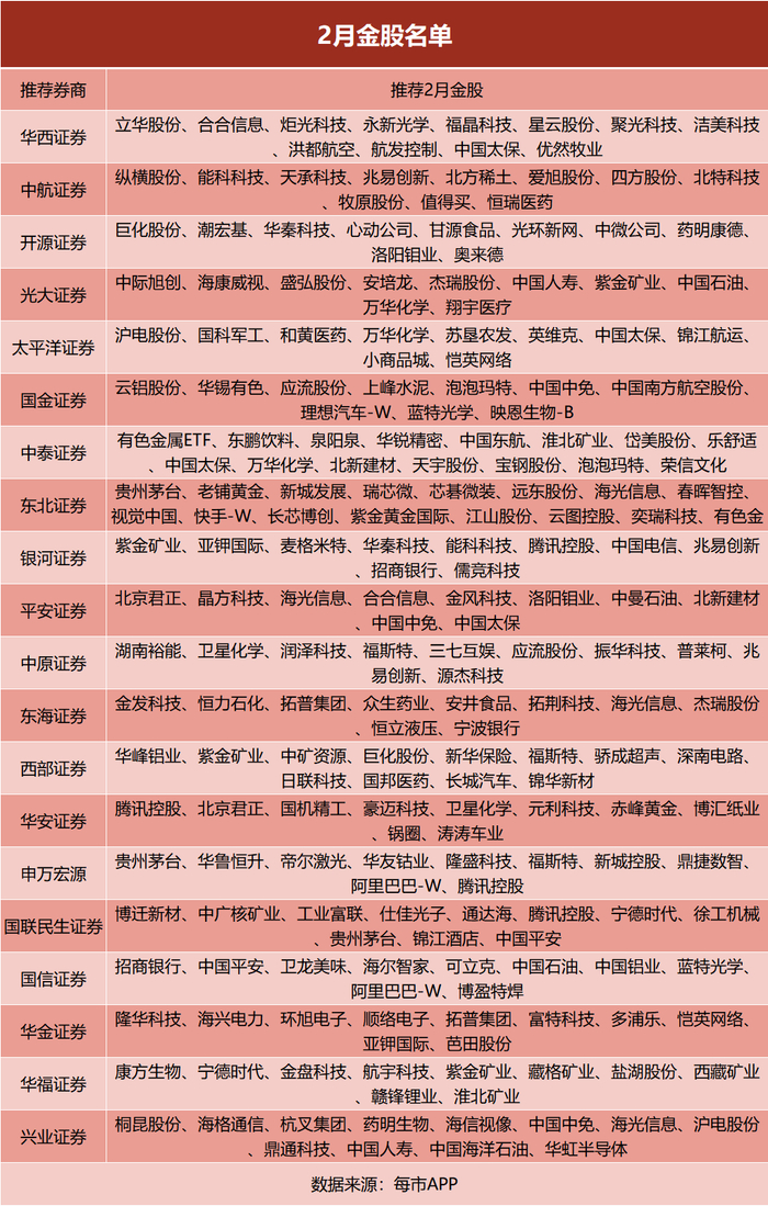 进入2月,新一期券商金股名单陆续出炉,主要集中在电子、机械设备、有色金属等行业。个股方面,海光信息、腾讯控股、中国太保、紫金矿业的人气最高。