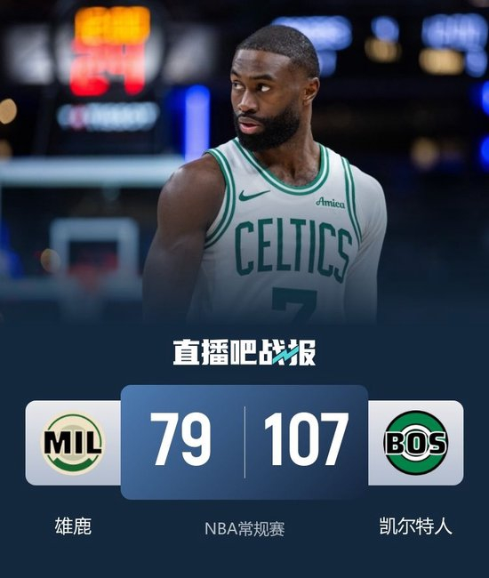 比赛开始,雄鹿反客为主打出12-0的开局,怀特和杰伦·布朗拿分破荒,西蒙斯挺身而出,连续三分命中独得11分帮助球队扳平比分,次节雄鹿命中率骤降,凯尔特人多点开花轰出14-2的攻击波一举取得两位数优势,半场战罢凯尔特人56-42领先雄鹿。易边再战,杰伦·布朗连得8分率队打出10-0将分差拉开到20分以上,雄鹿连投带罚缩小分差,末节凯尔特人稳扎稳打保持大比分的领先,最终,凯尔特人107-79大胜雄鹿,送给对手5连败。
