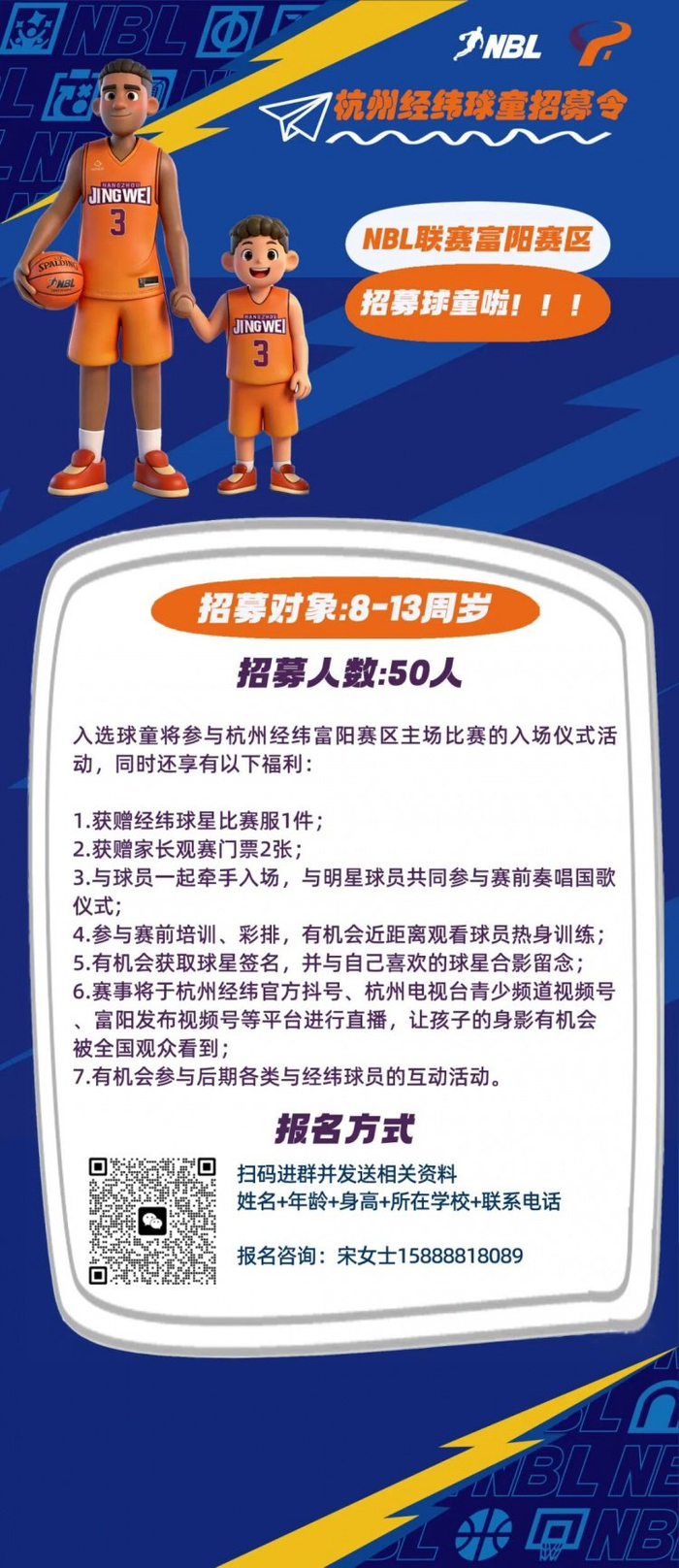 赛场之上,除了球员们的激烈角逐点燃全场激情,赛前携手球员登场的球童们,也是一道治愈又亮眼的风景线,不仅让观众耳目一新,更成为球员们赛前最温暖的陪伴。现正式开启NBL联赛(浙江富阳赛区)球童招募!经过筛选,最终将有50名幸运少年登上全国男子篮球联赛的舞台,与经纬明星球员并肩完成入场仪式,亲身经历这场职业篮球盛宴。更有多重专属福利等你来解锁,报名详情请查阅官方报名海报!