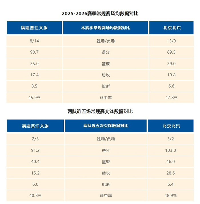 2025-2026赛季CBA常规赛第二十三轮,福建晋江文旅男篮奔赴客场挑战北京北汽男篮,从本赛季整体数据来看,主队福建晋江文旅男篮场均得分90.7分略高于北京的89.5分,场均8.5次抢断的防守反击能力也优于北京北汽男篮的6.6次,但在防守以及篮板方面,北京北汽男篮以场均83.4的失分排名联赛第六,场均39个篮板位列联赛第七,其内线保护和防守端的限制将对主队造成巨大的困扰。