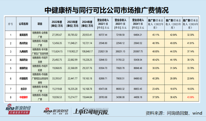 除了2023年,中健康桥计提市场推广费及占“销售费用-推广费”的比重排名第二之外,2022年度和2024年度都是排名第一,显著高于同行均值。