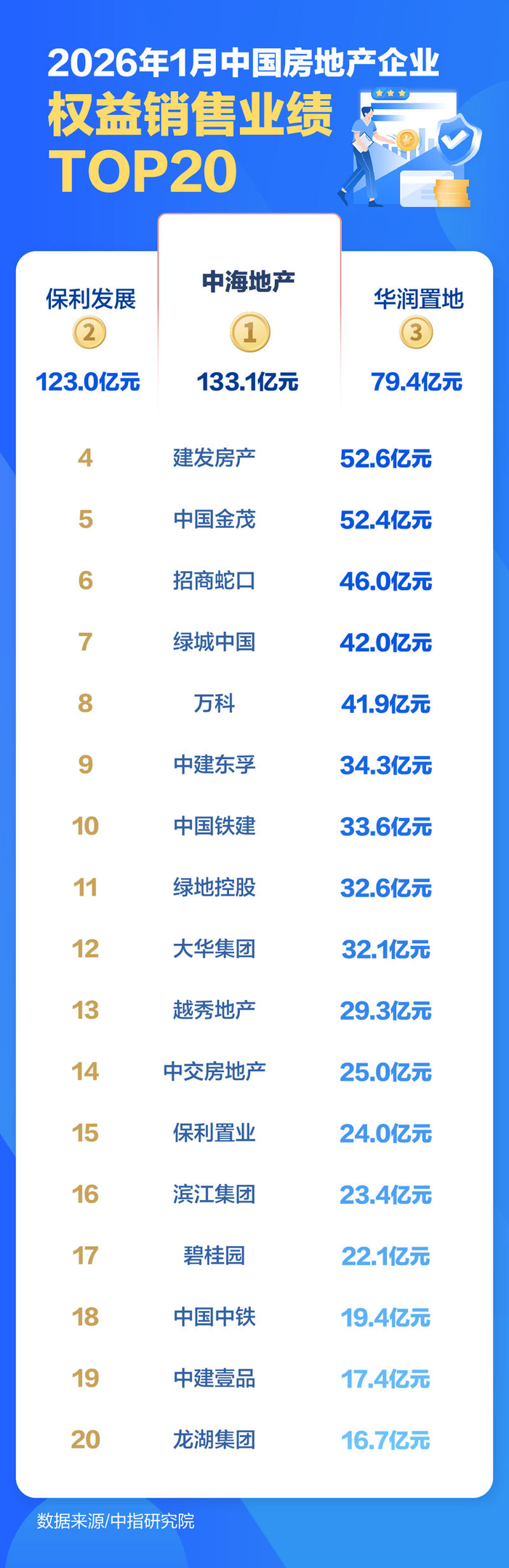 值得注意的是,相比2025年,今年1月的TOP10房企中出现了“新面孔”,那就是中旅投资,其以92.8亿元的销售额,位列百强房企第5位。