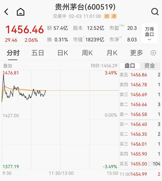 在前一日上涨后,2月3日上午开盘后贵州茅台股价再次上涨,开盘后一度涨超3%,位居白酒板块前列,随后涨幅收窄至2%左右。