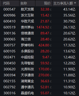 个股方面,航天发展获得逾43亿元主力资金净流入,浙文互联、华胜天成均获得超30亿元净流入,贵州茅台、信维通信、海兰信也都获得超20亿元净流入,罗博特科、永鼎股份等9股亦获得超10亿元净流入。