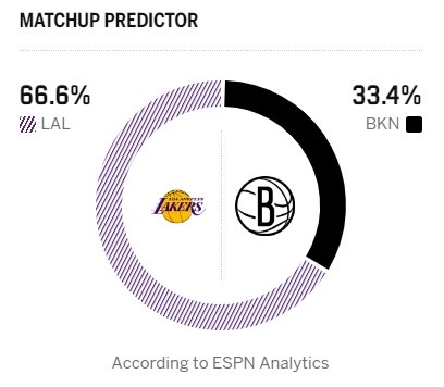 ESPN今日晒出了胜率预测,湖人高达66.6%,篮网为33.4%。