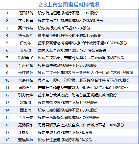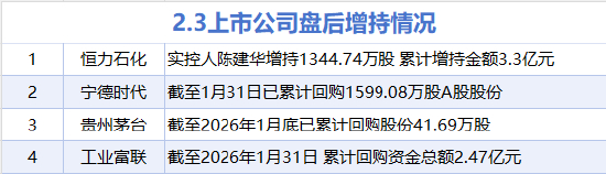 据统计,2月3日,盘后恒力石化、宁德时代、贵州茅台、工业富联披露增持情况。包括亿田智能、学大教育、高华科技、快克智能、伊戈尔、泰凌微、精测电子、金丹科技、长江通信、大豪科技、通源石油、引力传媒、富瀚微、西上海、长春一东、无锡振华、江盐集团、壹连科技在内的18家A股上市公司披露减持情况。