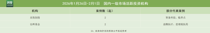 从机构投资活跃度来看,本周高瓴创投与弘晖基金较为活跃,分别完成2笔融资,主要聚集在科技与制造和医疗健康领域。