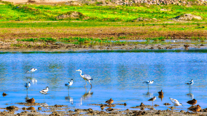立春时节,江苏省启东市滨江绿廊浅滩区域,水鸟在澄澈波光里自在踱步、游弋,岸边新绿萌动,枯黄与鲜翠交织,处处漾着春日初醒的生机,一幅湿地生态画卷,尽显自然和谐之美。(江苏省启东市纪委监委供 潘杨 摄)