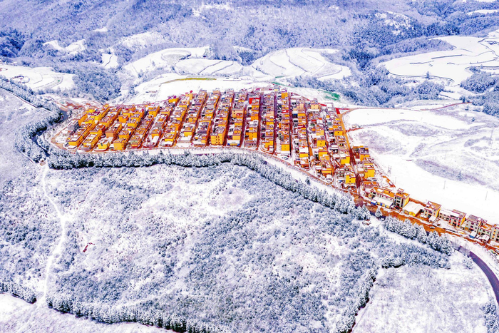 立春时节,在云南省昆明市寻甸县甸沙乡,皑皑白雪为大地覆上绒毯,橙黄的屋舍在素白的雪坡上错落排布,温暖又明亮。(云南省昆明市寻甸县纪委监委供 李兴富 摄)