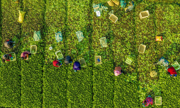 重庆市南川区兴隆镇金花村的菜心种植基地里,农民们正抢抓农时采收菜心。从高空俯瞰,连片的绿色菜田与劳作的身影、满载的菜筐相映成趣,勾勒出一首充满生机的田园乐章。(重庆市南川区纪委监委供 胡波 摄)