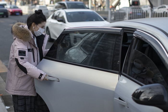 2026年2月3日,中国北京,一名乘客正在使用隐藏式门把手开启车门。 IC Photo