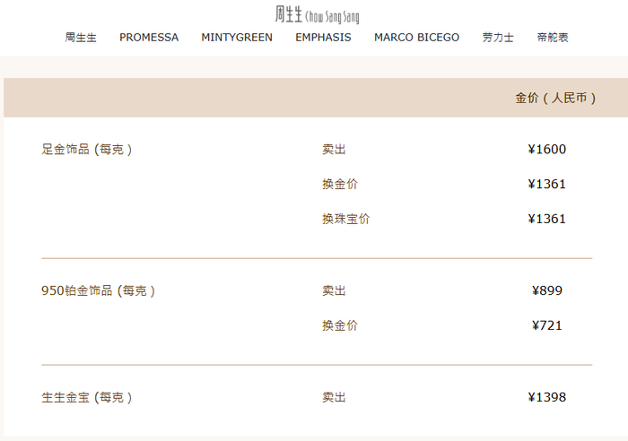 最新金价显示,周生生足金饰品报1600元/克,较前一日1498元/克涨102元。