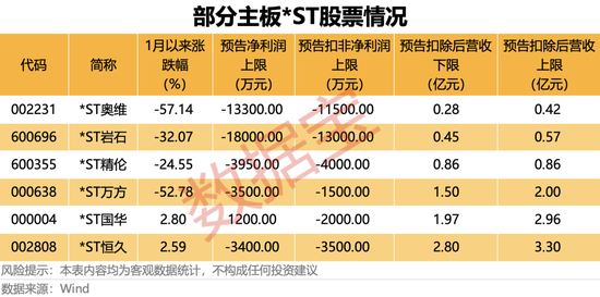 据证券时报·数据宝统计,沪深主板的*ST股票中,有5只个股2025年年报预计营业收入低于3亿元且归母净利、扣非净利孰低者为负值,分别为*ST万方、*ST岩石、*ST奥维、*ST精伦、*ST国华。