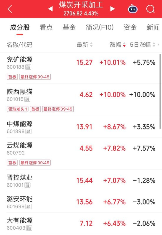 煤炭板块盘初拉升。兖矿能源、陕西黑猫涨停,云煤能源触及涨停,中煤能源、晋控煤业、潞安环能等多股跟涨。