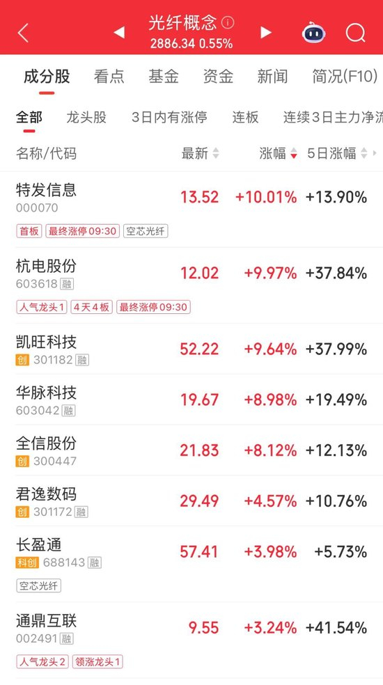 盘初,光纤概念股活跃。杭电股份(603618)四连板,特发信息涨停,凯旺科技涨超9%,华脉科技、全信股份等跟涨。消息面上,根据华泰证券2月2日研报,2026年1月,中国市场G.652.D单模光纤价格创下近七年来的新高,平均价格来到35元/芯公里以上。