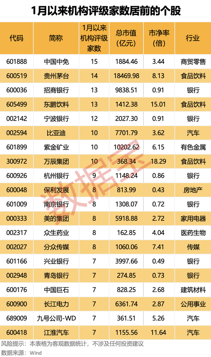 从个股来看,1月以来共有40股获至少5家机构评级,其中中国中免、贵州茅台获机构评级家数居前,分别有15家、14家,招商银行东鹏饮料获机构评级家数均为13家。