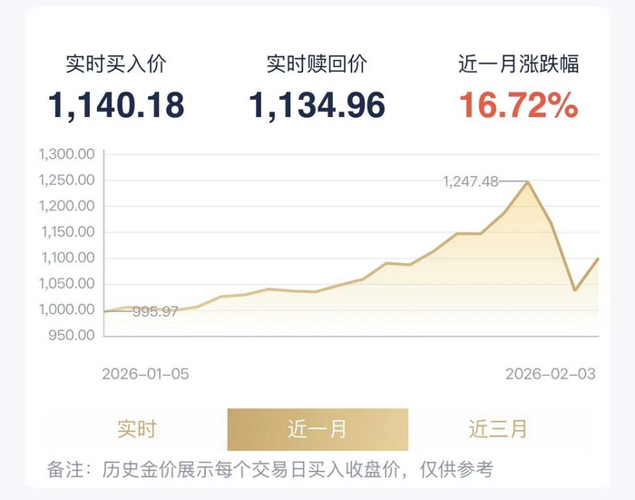 “去年看着积存金跟着国际金价涨起来,从12月到今年1月,积存金克价跨越了千元大关。买入的时候还以为太迟了,没想到不到一个月时间,积存金的价格就冲到每克一千两百多元,很快积存金克价就跌了下来,跌回了1月初的水平。”有个人投资者向第一财经记者回顾一个月以来积存金持仓感受。