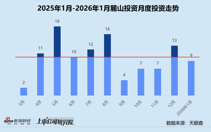 统计区间内,麓山投资公开披露的股权投资事件共9起,与2025年12月相比下降30.8%。往期数据显示,机构的投资高峰出现在2025年5月、8月和12月,而同年3月和9月则降至谷底。由此可见,麓山投资倾向于在市场窗口期或项目成熟期进行集中式、脉冲型布局。