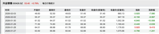 2月3日收盘后,兴业银锡发布《关于高级管理人员增持公司股份的公告》。公告显示,公司董事会秘书孙凯于当日以49.83元/股的价格买入公司4万股股票,成交金额约199.32万元。49.83元/股,正是公司当日的跌停板价格,而这一天,已是兴业银锡连续第三个跌停。