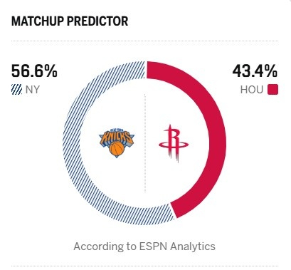 ESPN预测本场比赛胜率:火箭43.4%,尼克斯56.6%。